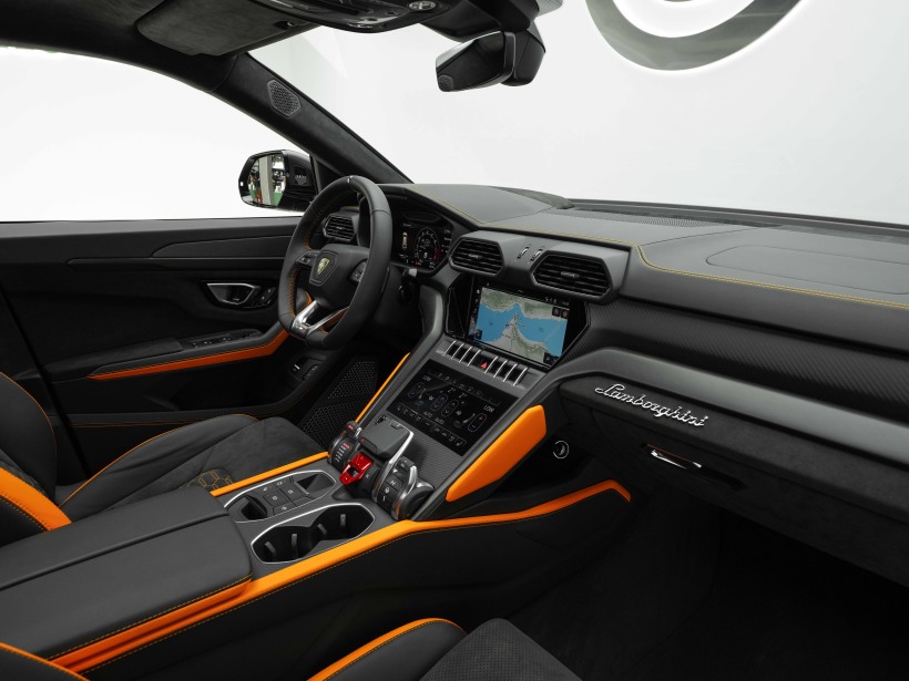 The interior of the 2022 Urus Graphite Capsule mirrors its bold exterior, featuring a sophisticated blend of luxury and performance-oriented design. The cabin is lined with Alcantara and matte-finish carbon fiber, while the contrasting exterior accent colors are reflected in the stitching, seat upholstery, and air vents, creating a cohesive and dynamic interior theme. The Graphite Capsule also offers Lamborghini’s advanced infotainment system, with dual touchscreens controlling everything from navigation to climate settings, ensuring both driver and passengers enjoy a high-tech and luxurious environment.